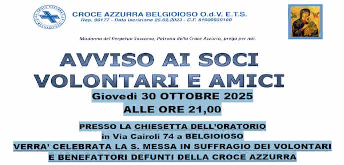 Giovedì 30 OTTOBRE 2025, ALLE ORE 21,00 –PRESSO LA CHIESETTA DELL’ORATORIO- VERRA’ CELEBRATA LA S. MESSA IN SUFFRAGIO DEI VOLONTARI E BENEFATTORI DEFUNTI DELLA CROCE AZZURRA